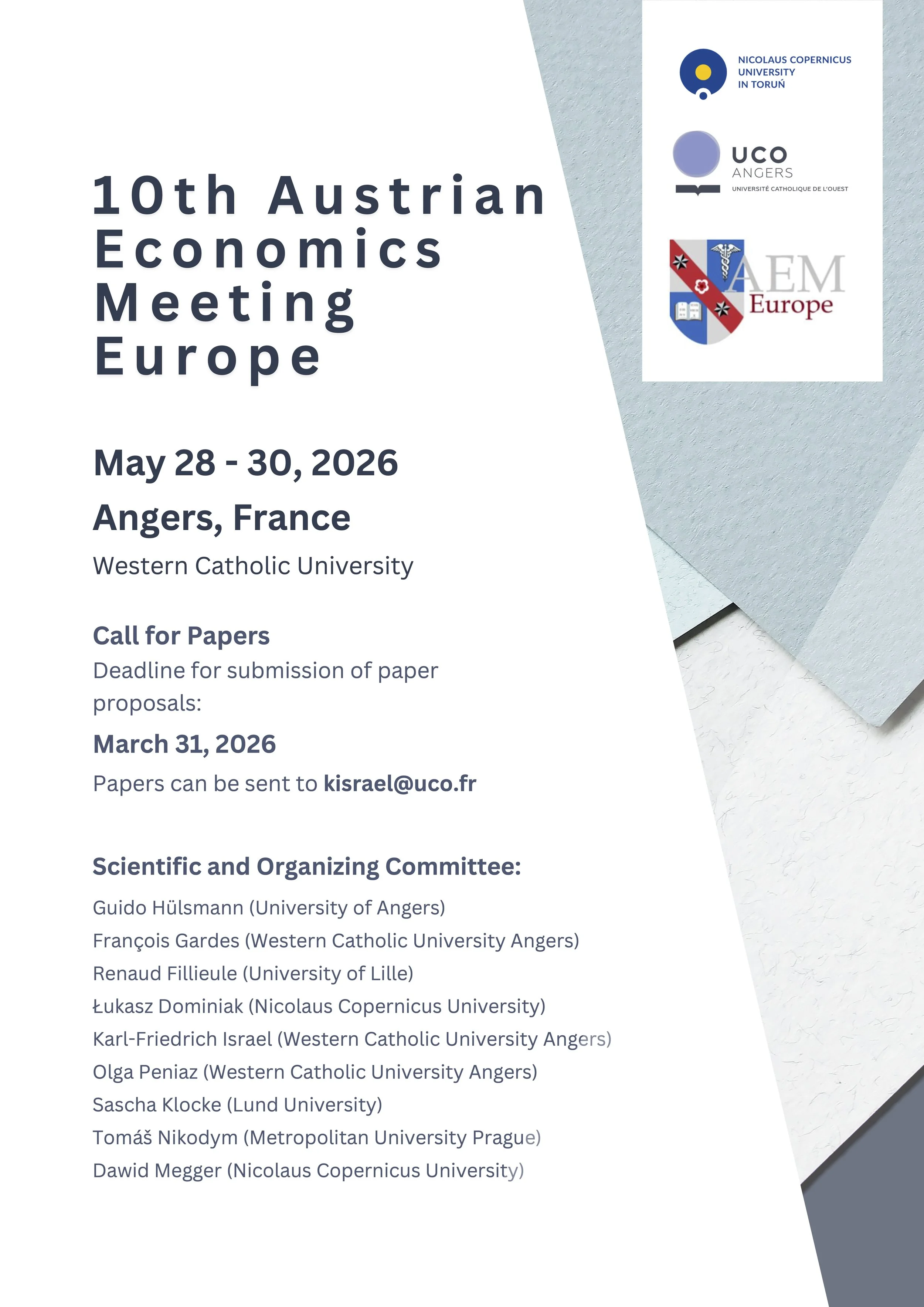 The Austrian Economics Meeting Europe (AEME) is an organisation of young European scholars in the Austrian tradition which holds an annual academic conference where participants have an opportunity to listen to presentations of contemporary Austrian research by graduate students and early career researchers, as well as present their own research to others. Usually, the meeting spans three days, and attendees do not only join the conference proper, but also go on sightseeing tours in the historic cities, enjoy lunch and dinner together, and continue their discussions over some drinks in the evenings.